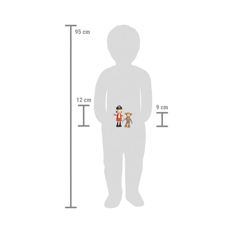 Das 6er-Set Biegepuppen von small foot bringt das Piratenabenteuer in euer Spielzimmer. Diese detailreichen Puppen sind flexibel, robust und im typischen Piraten-Look gestaltet. Mit Kapitänin, Crew-Mitgliedern und einem Äffchen erlebt ihr aufregende Abenteuer auf hoher See. Die Hakenhände der Kapitänin und des Äffchens sowie die Schwanzspitze sind aus umweltfreundlichem Kunststoff gefertigt. Das Äffchen kann sich dank dieser Haken überall festhalten. Die Figuren sind ideal für kleine Kinderhände, einfach zu greifen und die perfekte Ergänzung zum Piratenschiff für Biegepuppen. Ein unverzichtbares Set für alle kleinen Freibeuter!
