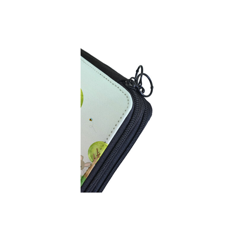 TECHNISCHE DATEN: Größe 21 x 16 x 4 cm (B/L/H). Das Schulmäppchen besteht aus 70% Polyester, 20% Pappe, 10% Baumwolle. Die bedruckte Oberseite hat ein Maß von 20,8 x 15 cm (B/L). Der Aussenkorbus ohne Druck ist schwarz.