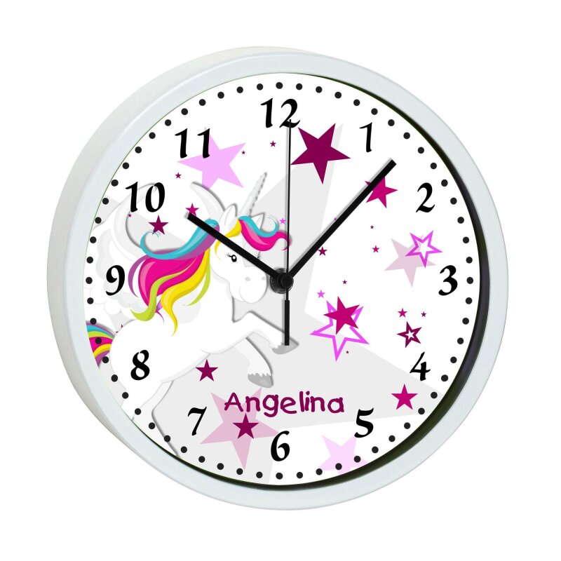 Kinder Wanduhr laufruhig mit bunten Rahmen Einhorn Sterne rosa