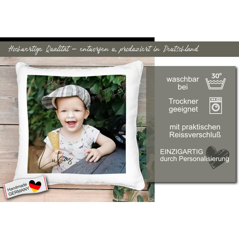 Das Kissen ist mit einer weichen Polyesterfüllung gefüllt und wird mit einem liebevoll gestalteten Motiv und dem Namen eures Kindes personalisiert.