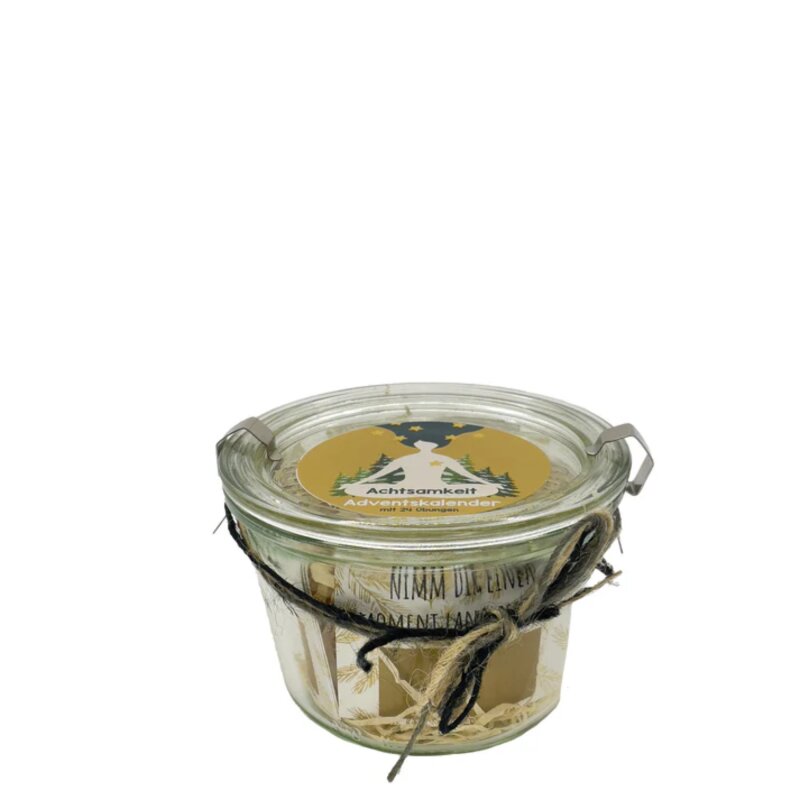 Entspannung und Achtsamkeit für die Adventszeit. Bereite dich auf eine besinnliche Zeit vor mit dem Achtsamkeits Adventskalender im Weckglas. Jeden Tag wartet eine kleine Überraschung zum Freirubbeln, die dich zu mehr Gelassenheit und innerer Ruhe führt. Der Kalender bietet 24 achtsame Aufgaben, die dir helfen, den Stress abzubauen und bewusste Momente für dich selbst zu schaffen. Rubbel jeden Tag ein Türchen frei und gönn dir deine persönliche Auszeit.